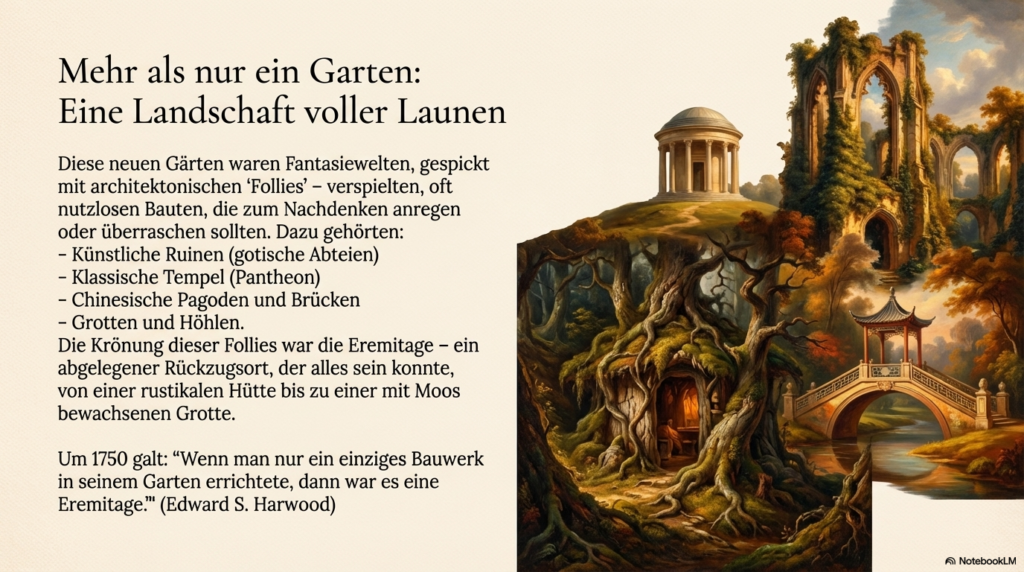 Dieser Mann war im Grunde ein lebendes Dekostück: Ein Angestellter, dessen einzige Aufgabe darin bestand, für die Gäste des Hausherrn den tiefsinnigen Sonderling zu spielen. Zu diesem Zweck baute man eigens kleine Hütten oder Grotten, die sogenannten „Follies“ oder Gartenruinen – verrückte Bauwerke, die absichtlich baufällig und wild aussehen sollten.