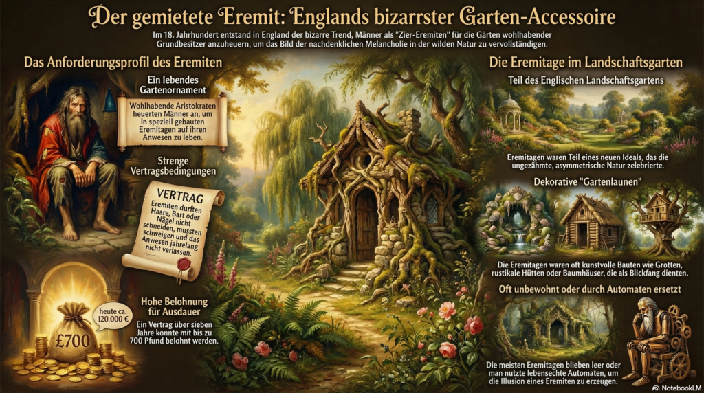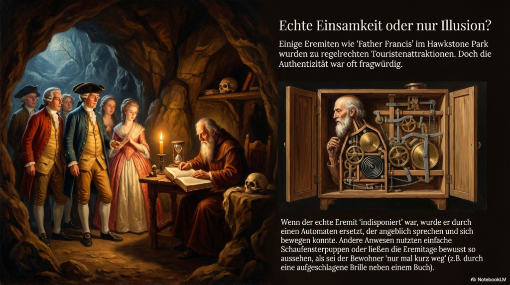 Es war ein verdammt einsamer Job, den kaum jemand über die volle Vertragszeit durchhielt. Manche Besitzer verlangten sogar, dass ihre Eremiten bei Wind und Wetter barfuß herumliefen, um die „Wildnis“ echter wirken zu lassen.