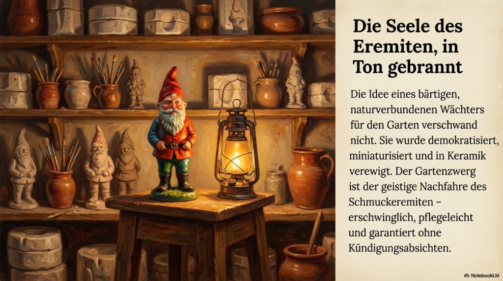 Hier schlägt die Geschichte eine Brücke nach Deutschland, genauer gesagt nach Thüringen. Dort begannen geschickte Handwerker damit, bärtige Gestalten im kleinen Maßstab aus gebranntem Ton herzustellen. Sie vermischten das Bild des alten Eremiten mit den Sagenfiguren aus den Wäldern – den Zwergen und Gnomen. So verwandelte sich der einst traurige, schmutzige und schweigende Einsiedler in den freundlichen, bunten Kerl mit der roten Mütze, den wir heute als Gartenzwerg kennen. Der lange weiße Bart und die einfache Kutte sind geblieben, der Totenkopf wurde durch eine Gießkanne oder andere Dinge ersetzt.