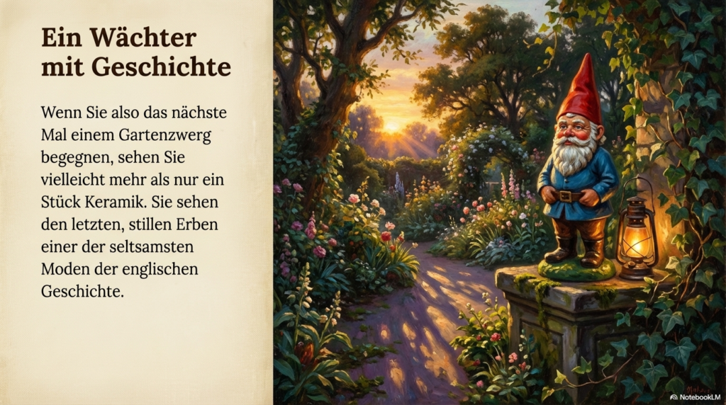 Wenn Sie das nächste Mal an einem dieser kleinen Kerle vorbeikommen, denken Sie daran, dass er ein adliges Erbe antritt und uns an eine Zeit erinnert, in der man echte Menschen für die Gartenruhe mietete. Nun muss ich mich aber wieder meinen Hecken widmen, die meine volle Aufmerksamkeit brauchen. Ich hoffe, Sie besuchen mich bald wieder, hier im Garten von Puddlewick Hall.