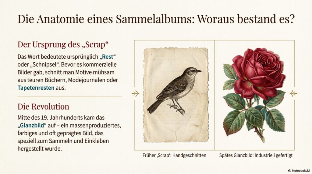 Sehen Sie, der Begriff „Scrap“ selbst, also Schnipsel, kam ursprünglich daher, dass man, bevor es kommerzielle Bilder gab, einfach Motive aus teuren Büchern, Modejournalen oder sogar Tapetenresten ausschnitt. Doch dann kam die industrielle Revolution und veränderte alles. Etwa in der Mitte des 19. Jahrhunderts ermöglichte eine ganz wunderbare Erfindung namens Chromolithografie den Massendruck von farbigen Bildern.