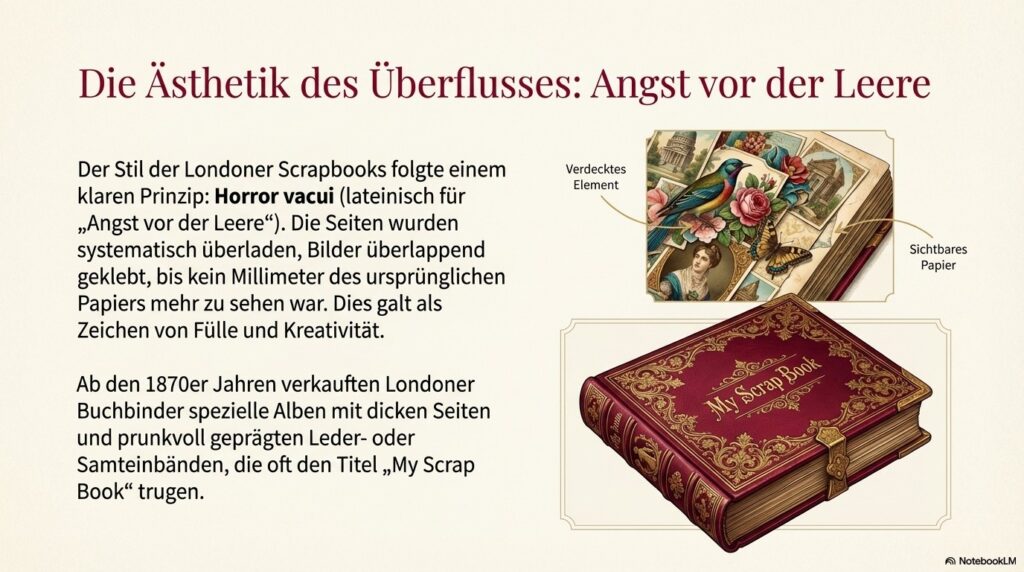 Ah, da sind Sie ja, meine Lieben! Kommen Sie nur herein. Suchen Sie sich ein bequemes Plätzchen, und lassen Sie mich Ihnen eine schöne Tasse Tee einschenken. Wissen Sie, ich war heute Morgen auf dem Dachboden – ein Ort, der mehr Geheimnisse birgt als die Londoner Klatschspalten, das kann ich Ihnen versichern – und dort, unter einem Stapel alter Decken, stieß ich auf eine überladene, prall gefüllte Sammelmappe meiner Ururgroßtante Beatrix. Ein wahres Ungetüm aus geprägtem Samt, das beinahe auseinanderfiel. Und was darin war! Ein kunterbuntes, überbordendes Chaos aus ausgeschnittenen Bildchen, Kärtchen und Schnipseln. Man nannte das damals „Scrapbooking“, und es war, meine Lieben, eine regelrechte Manie im viktorianischen London. Eine Leidenschaft, die weit, weit über das hinausging, was Sie sich vielleicht unter dem bloßen Einkleben von Bildern vorstellen.