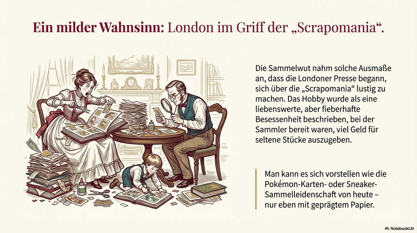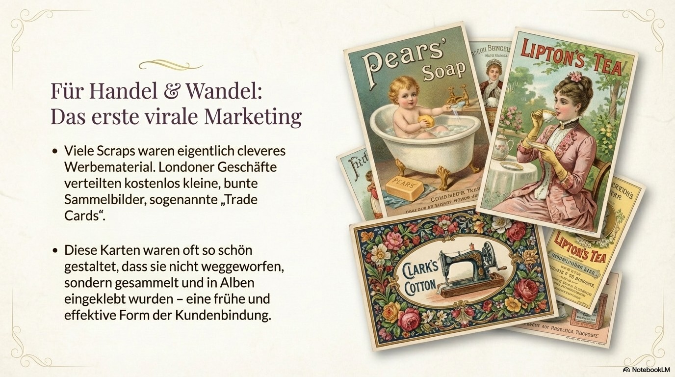 Wenn ich mir also Tante Beatrix‘ Album hier so ansehe, wird mir klar, dass diese Sammelalben so viel mehr waren als nur ein einfacher Zeitvertreib. Sie waren eine frühe Form des Marketings, denken Sie nur an die „Trade Cards“, diese kleinen, bunten Sammelbilder, die Londoner Geschäfte kostenlos verteilten und die eifrig eingeklebt wurden. Und für uns Historiker sind sie eine unschätzbare Quelle. Sie erzählen vom Alltagsleben, von der Ästhetik, von den geheimen Wünschen und den kleinen Freuden einer ganzen Epoche.