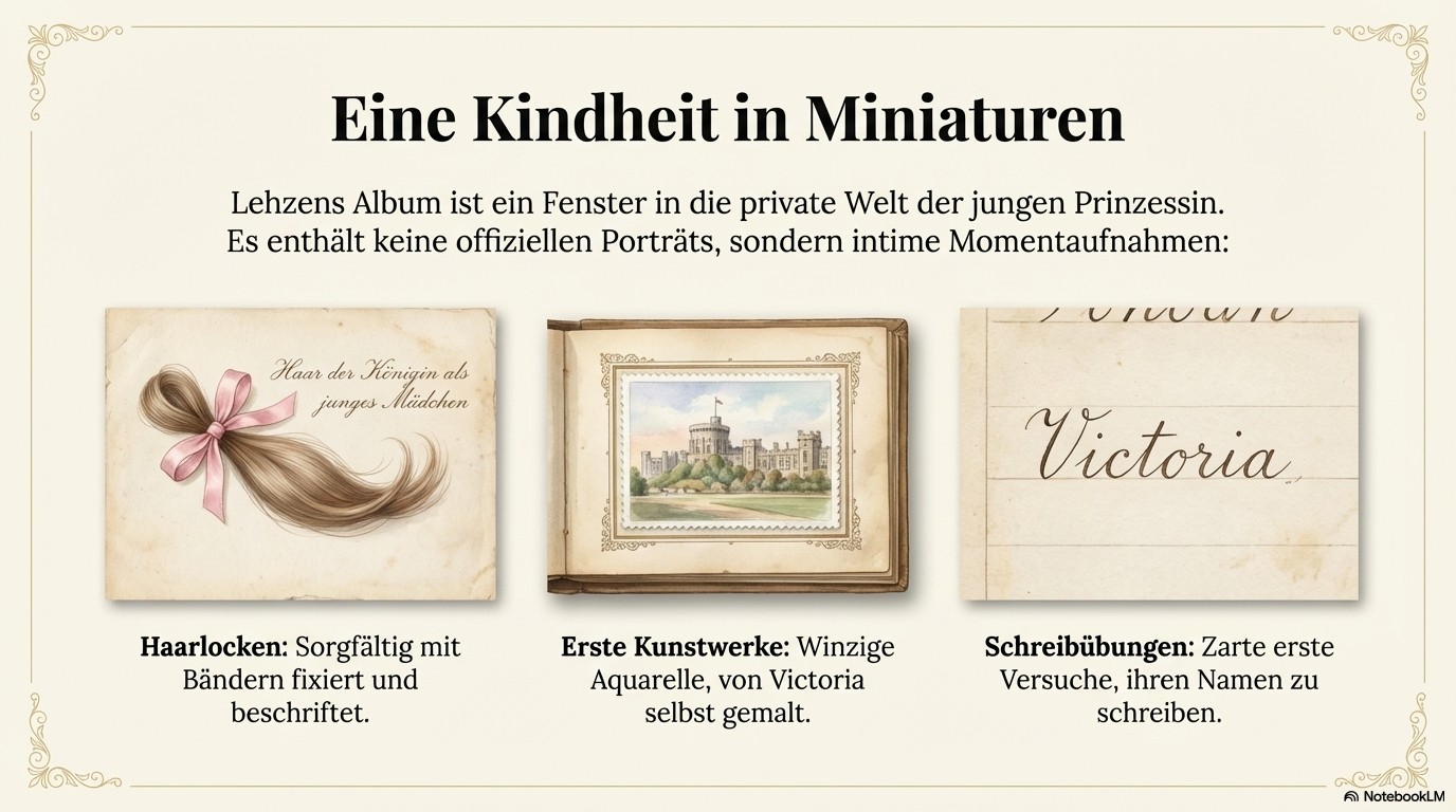 Und das, meine Lieben, bringt uns zum eigentlichen Kern der Sache, zum charmantesten Tratsch überhaupt. Denn die größte „Influencerin“ dieser ganzen Bewegung war keine Geringere als Königin Victoria selbst. Ihre eigene, schier unbändige Begeisterung für das Scrapbooking machte das Hobby erst so richtig gesellschaftsfähig. Man kann sich das vorstellen: Wenn die Königin im Buckingham Palace fleißig klebte, dann tat es auch der Rest von London. Ein besonders entzückendes Detail dazu findet sich im Nachlass ihrer deutschen Gouvernante, der Baronin Louise Lehzen, mit der sie eine fast mütterliche Beziehung pflegte. Die Baronin führte ein ganz persönliches Sammelalbum, und was sie darin aufbewahrte, ist einfach herzergreifend. Es enthielt nicht nur von der jungen Prinzessin selbst gemalte Aquarelle, sondern auch Haarlocken der kleinen Victoria, säuberlich mit Faden gebunden, und sogar ein Stückchen Stoff von ihrem Hochzeitskleid.