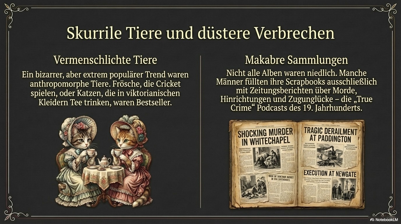 Und so, während ich hier mit Tante Beatrix‘ samtgebundenem Ungetüm sitze, sehe ich nicht nur ihre Sammlung, sondern ihre Welt. Ich sehe die „Trade Cards“ der Geschäfte, die sie besuchte, die morbide Neugier in einem Zeitungsausschnitt, die pure Freude an einer lächerlich overdressten, teetrinkenden Katze. Es ist wahrhaftig ein Fenster in ihre Seele. So, meine Lieben, aber nun ist mein Tee kalt geworden, und ich habe Sie lange genug mit meinen Geschichten vom Dachboden aufgehalten. Ich hoffe, es hat Ihnen gefallen. Kommen Sie bald wieder nach Puddlewick Hall, die nächste Kanne Tee wartet schon.